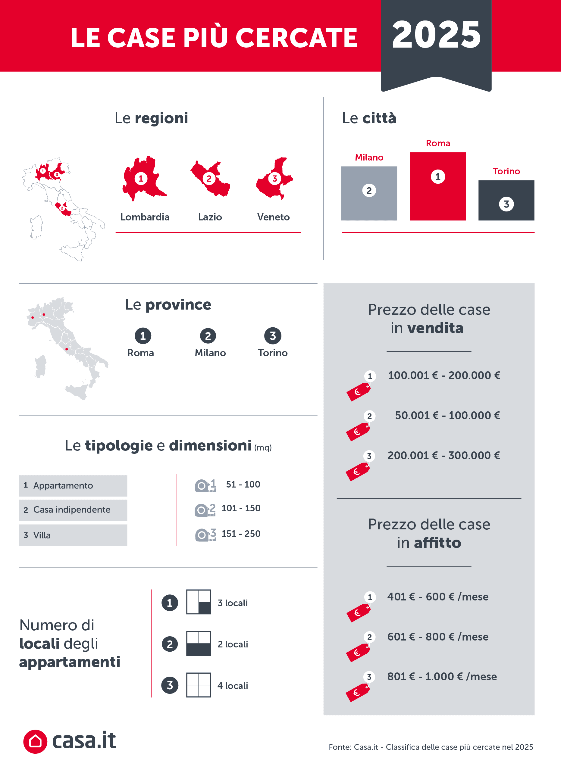 Milano, 30 dicembre 2025 – Come ogni anno Casa.it fotografa quali sono le tendenze di ricerca delle case in vendita e in affitto in Italia e pubblica la classifica delle case più cercate nel 2025: i luoghi, le tipologie, le metrature e i prezzi di vendita e affitto delle case che le persone hanno cercato di più nel 2025.