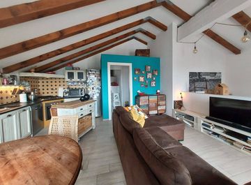 Composizione abitazione: Tramite scala interna in pietra di Luserna, raggiungiamo l'abitazione che si sviluppa al piano superiore, la zona giorno open space si presenta spaziosa, luminosa e caratterizzata dai travi a vista, cucina angolare con porta finestra che accede al balcone con vista sul Monviso. Dal disimpegno raggiungiamo la cameretta, camera matrimoniale ed infine il servizio. Al piano inferiore troviamo...